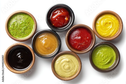 Variety of dipping sauces in bowls seen from above Isolated on white are pesto ketchup BBQ mustard marinara ranch romesco and soy sauce