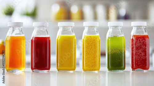 Variety of freshly made fruit and vegetable juices or smoothie in clear bottles on a kitchen counter.