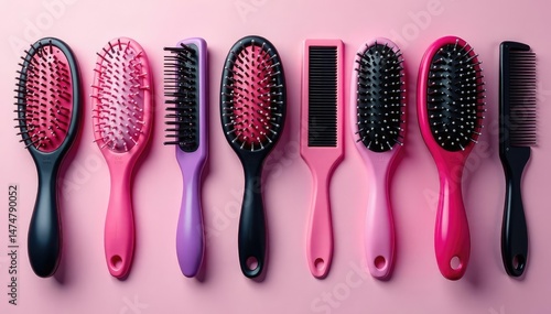 Variety of hairbrushes and combs neatly arranged , different, combs