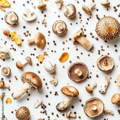 Variety of mushrooms scattered on a pure white background, aerial perspective, perfect for cooking class visuals, even lighting, vibrant and detailed scene style