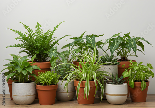 Variety Of Potted Plants In Terracotta And Ceramic Pots Photo