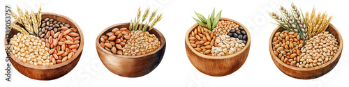Variety of Whole Grains and Seeds in Wooden Bowls on White Background