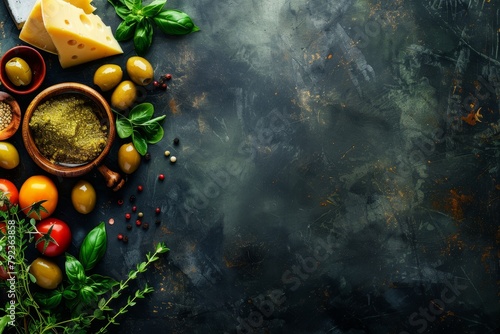 Various cheeses olives herbs on dark vintage texture Top view Background design with text space