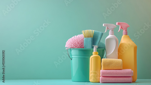 Various cleaning products including sprays, liquids, and towels in a cleaning kit