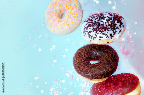 Various decorated doughnuts in motion falling Sweet and colourful donuts