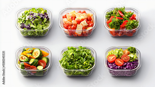 Various fresh vegetable salads with tomatoes, cucumbers, and peppers in disposable plastic containers, arranged on a clean background for a food delivery