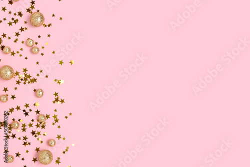 Various gold colored glittering confetti on a pink pastel background with copy space.