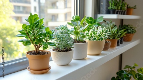 Various houseplants in terracotta and white pots on a windowsill