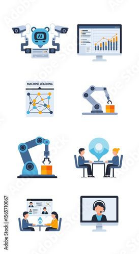 Various icons representing artificial intelligence, technology, business, and data analysis concepts.