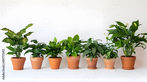 Various potted plants lined up on a white background