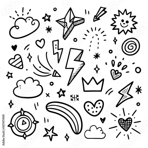 Various set icons. Hand drawn design elements. Hand drawn chalk and marker brush vector set.