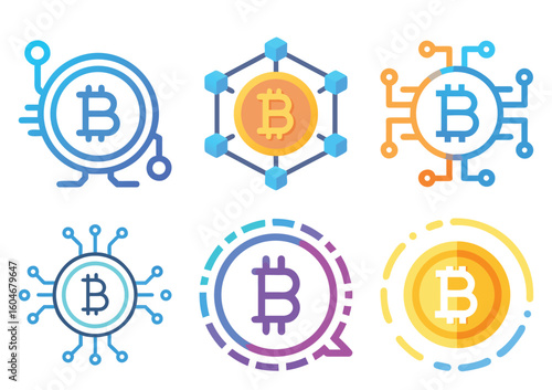 Various stylized Bitcoin icons representing digital currency and blockchain technology