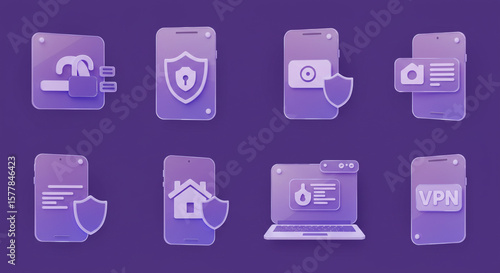 Various transparent security icons on phones and a laptop against a purple background displayed neatly