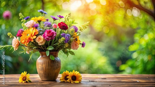 Vase with colorful flowers and leaves arranged in a natural setting, vases, flowers, arrangement, floral, blossoms, leaves