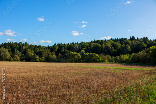Vast autumnal field stretching towards a dense forest under a clear blue sky. A serene rural landscape evoking peace and endless space
