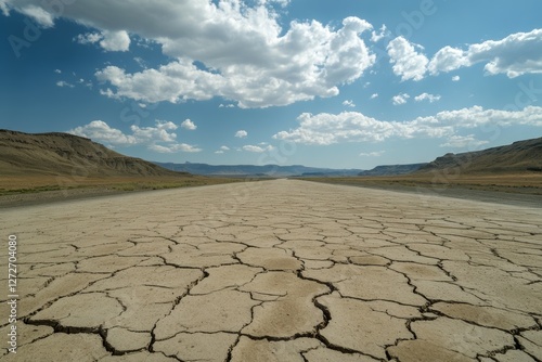 Vast Dry Desert Landscape with Cracked Earth, Rolling Hills, and a Blue Sky Dotted with White Clouds