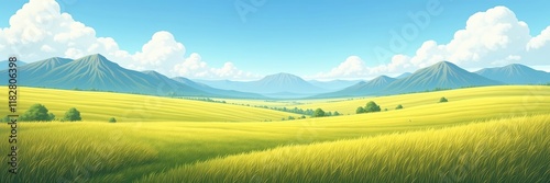 Vast golden fields meeting distant mountains under a clear blue sky with fluffy clouds