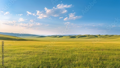 Vast Golden Grassland Stretching Towards Rolling Green Hills Under Blue Sky, Kazakhstan, Copy Space