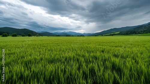 Vast green field under a moody sky with threatening clouds and mountains in the background showcasing natural beauty : Generative AI