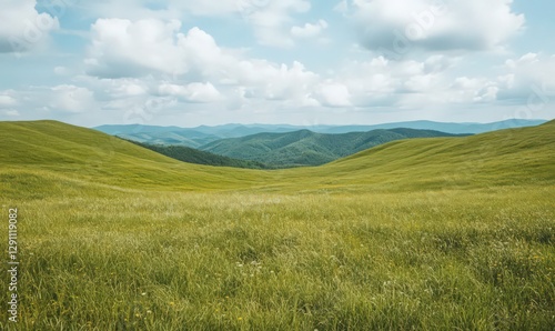 Vast Green Field with Rolling Hills Under a Partly Cloudy Sky