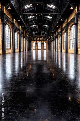 Vast industrial space high ceilings large windows reflective floor