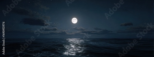 Vast ocean at night, illuminated by a full moon