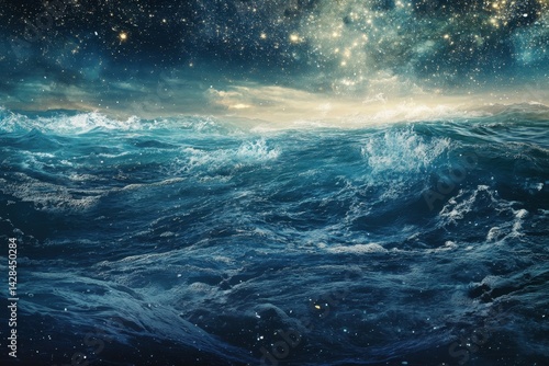 Vast ocean waves illuminated by a starry night sky with shimmering stars