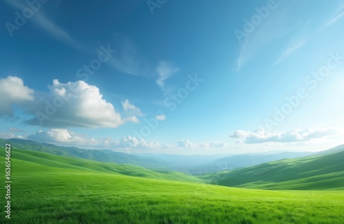 Vast open green landscape with undulating rolling hills under clear blue sky with soft white clouds. Sunlight illuminates scene, creating bright, peaceful, tranquil atmosphere. Rich vegetation,