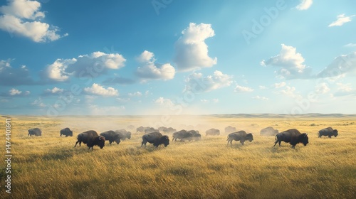 vast steppe where herds of wild bison roam freely. Dust rises from the ground as they thunder across the open plains beneath an endless blue sky