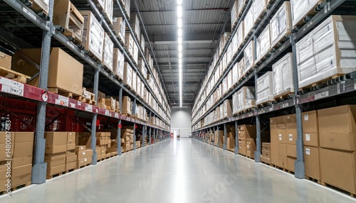 Vast Warehouse Aisle with Shelves of Cardboard Boxes and Storing Space