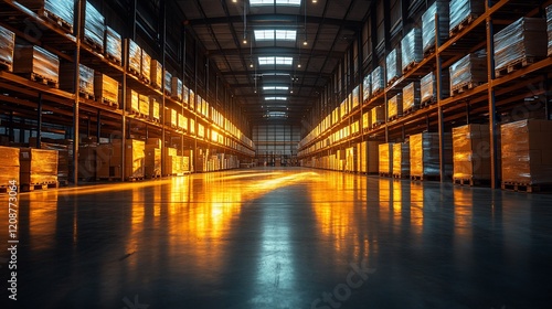 Vast Warehouse Interior: Rows of Pallets and Shelves, Industrial Architecture, Logistics and Distribution Center