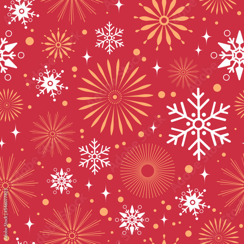 Vector abstract seamless pattern. Christmas and New Year. Snowflakes, fireworks and decorations. Red, gold and white color. Element for design and decor.
