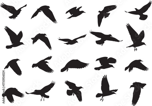 Vector art of a captivating collection of bird silhouettes, showcasing various species in dynamic flight poses, creating a sense of freedom and natural beauty, perfect for artistic and design projects