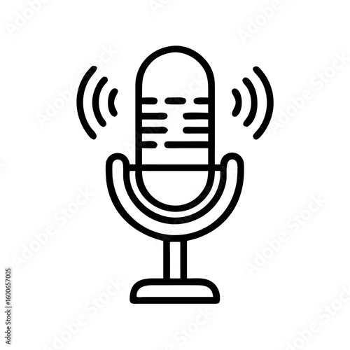 Vector art of a simple black and white line art icon of a vintage microphone with sound waves emanating from it symbolizing audio and broadcasting