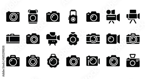 Vector art of collection of diverse camera icons representing various types of photographic equipment and technology