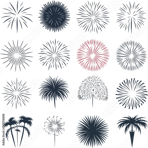 Vector art of collection of sixteen different vector fireworks, perfect for adding a touch of celebration to your designs and projects