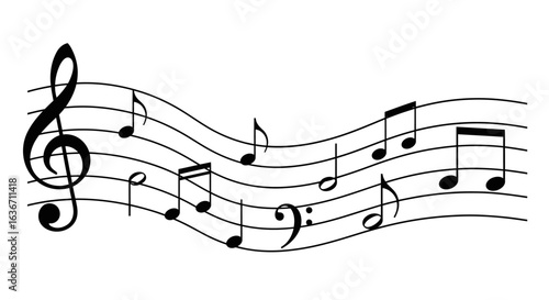 Vector art of musical notes and symbols on a staff with treble and bass clefs, representing melody and rhythm, isolated on white background