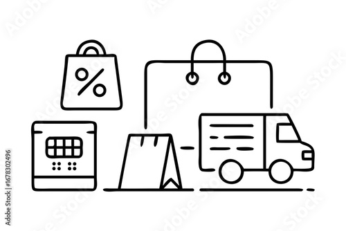 Vector art of online shopping and delivery concept with bag, cart, truck