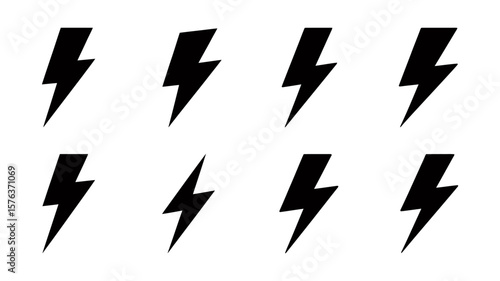 Vector art of set of eight black lightning bolt icons representing electrical energy on a white background