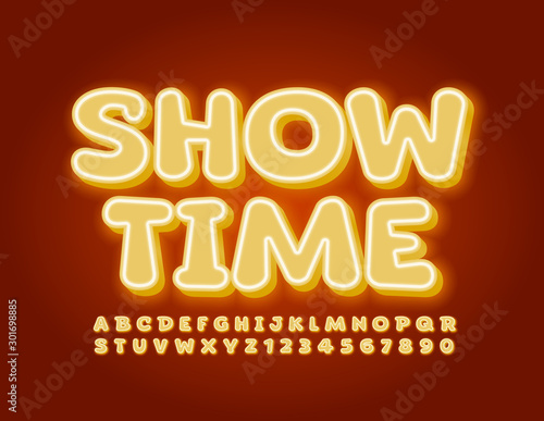 Vector bright Banner Show Time Glowing Font. Creative Alphabet Letters and Numbers