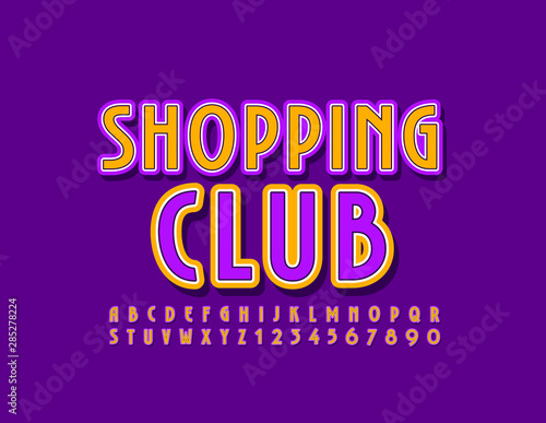 Vector bright Emblem Shopping Club with Colorful Font. Elegant Uppercase Alphabet Letters and Numbers.