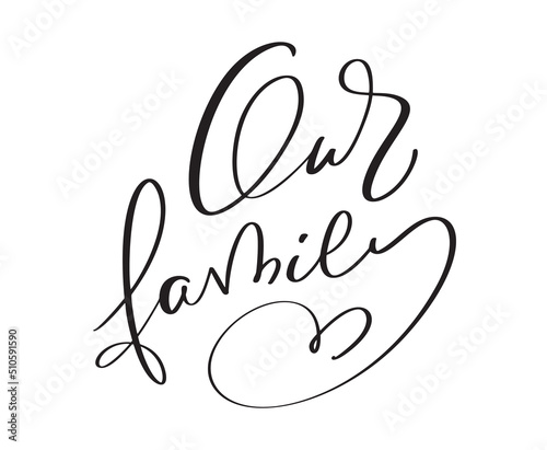 Vector calligraphy vintage text Our Family with heart. Inscription with smooth lines. Minimalistic hand lettering illustration