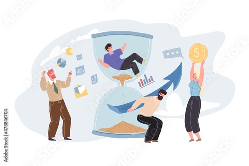 Vector cartoon flat characters,specialists team work with online apps elements,trying to help customer who trapped in huge hourglass-professional business workflow concept,site banner ad design