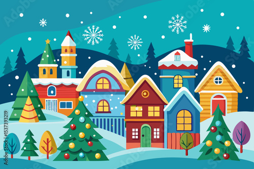Vector cartoon winter landscape with houses, snow, and Christmas trees, perfect for a holiday new year celebration card