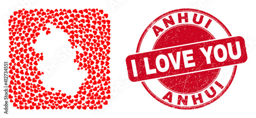 Vector collage Anhui Province map of love heart elements and grunge love badge. Mosaic geographic Anhui Province map created as carved shape from rounded square with valentine hearts.