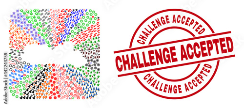 Vector collage Meghalaya State map of different symbols and Challenge Accepted seal. Collage Meghalaya State map constructed as hole from rounded square. Red round seal with Challenge Accepted tag.