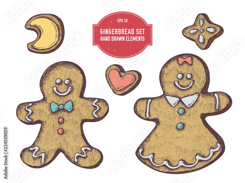 Vector collection of hand drawn colored gingerbread, gingerbread men