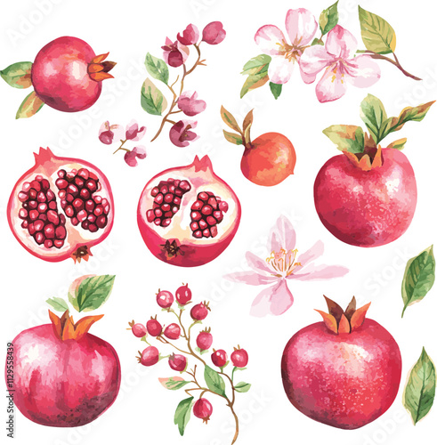 vector collection of pomegranate branches with flowers. pomegranate set. illustration vector set