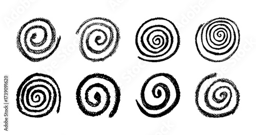 Vector collection of round spiral doodles in crayon, pastel, chalk, and charcoal. Kid-style wax squiggle swirls show liquid splash motion, curvy spin movement, like on a school chalkboard.