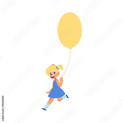 Vector flat little girl child walking, running with big colored air balloon in blue dress smiling. Happy female kid character for celebration party invitation card design. Isolated illustration